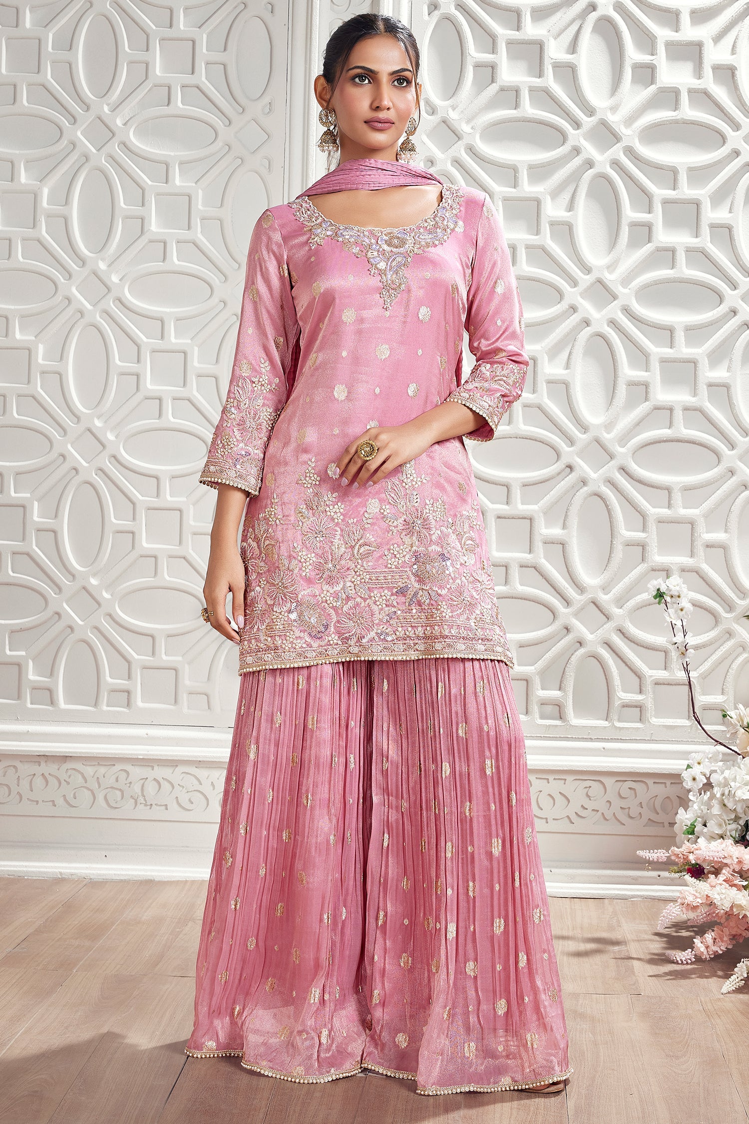 A graceful pink tissue woven straight cut sharara suit designed to highlight subtle festive elegance. The kurta is detailed with fine woven buttis, complemented by cutdana, sequin, and bead embroidery in soft floral motifs along the border. The neckline stands out with coordinated floral and paisley handwork, adding a refined focal touch. Lightweight and luminous, this ensemble is a perfect choice for celebrations, daytime festivities, and intimate occasions.