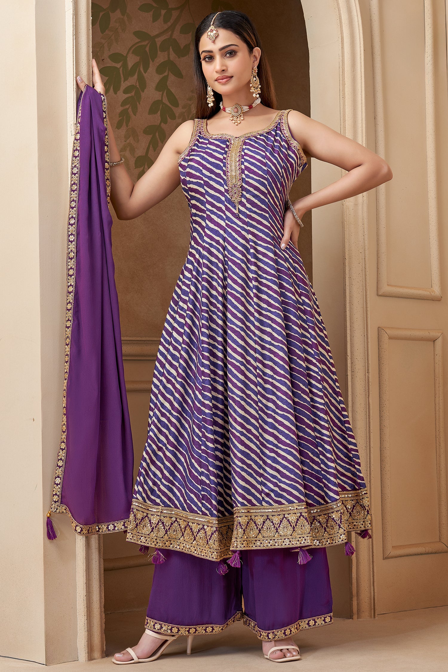Embodying a vibrant fusion of traditional prints and contemporary tailoring, this purple ensemble is expertly crafted from premium Georgette fabric. The set features a sleeveless Anarkali-style tunic with a structured neckline, showcasing a classic multi-colored Leheriya diagonal stripe print in contrasting shades. A defining focus is the bodice and hemline, which are lavishly adorned with intricate gold embroidery and finished with playful purple tassels for a dynamic look. The ensemble is paired with solid, fluid wide-leg palazzo trousers that feature an ornate gold-woven border at the base. Completed with a coordinating purple dupatta with a shimmering lace trim, this suit is an exquisite choice for festive celebrations and traditional wedding events.