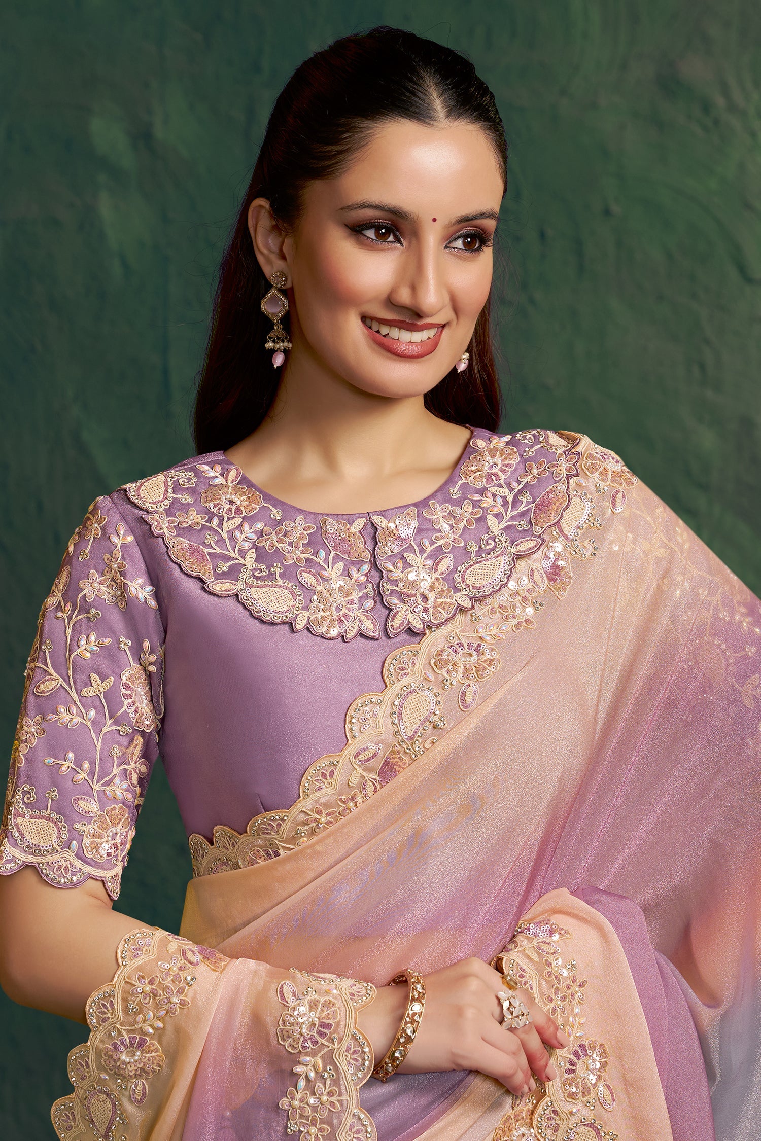 Celebrate the joy of colors with this Multi Colored Georgette Saree, a perfect blend of playful charm and sophisticated glamour. Crafted from premium lightweight georgette, this saree features a beautiful transition of vibrant hues that create a dynamic and eye-catching look. The fluid fabric ensures an effortless drape, hugging the silhouette perfectly while providing maximum comfort. To add a touch of festive shimmer, the saree is framed by a sleek border adorned with intricate embroidery and sparkling sequins. Paired with a contrasting Purple Georgette stitched blouse, this ensemble is an ideal choice for pre-wedding festivities, evening parties, and modern celebratory events.