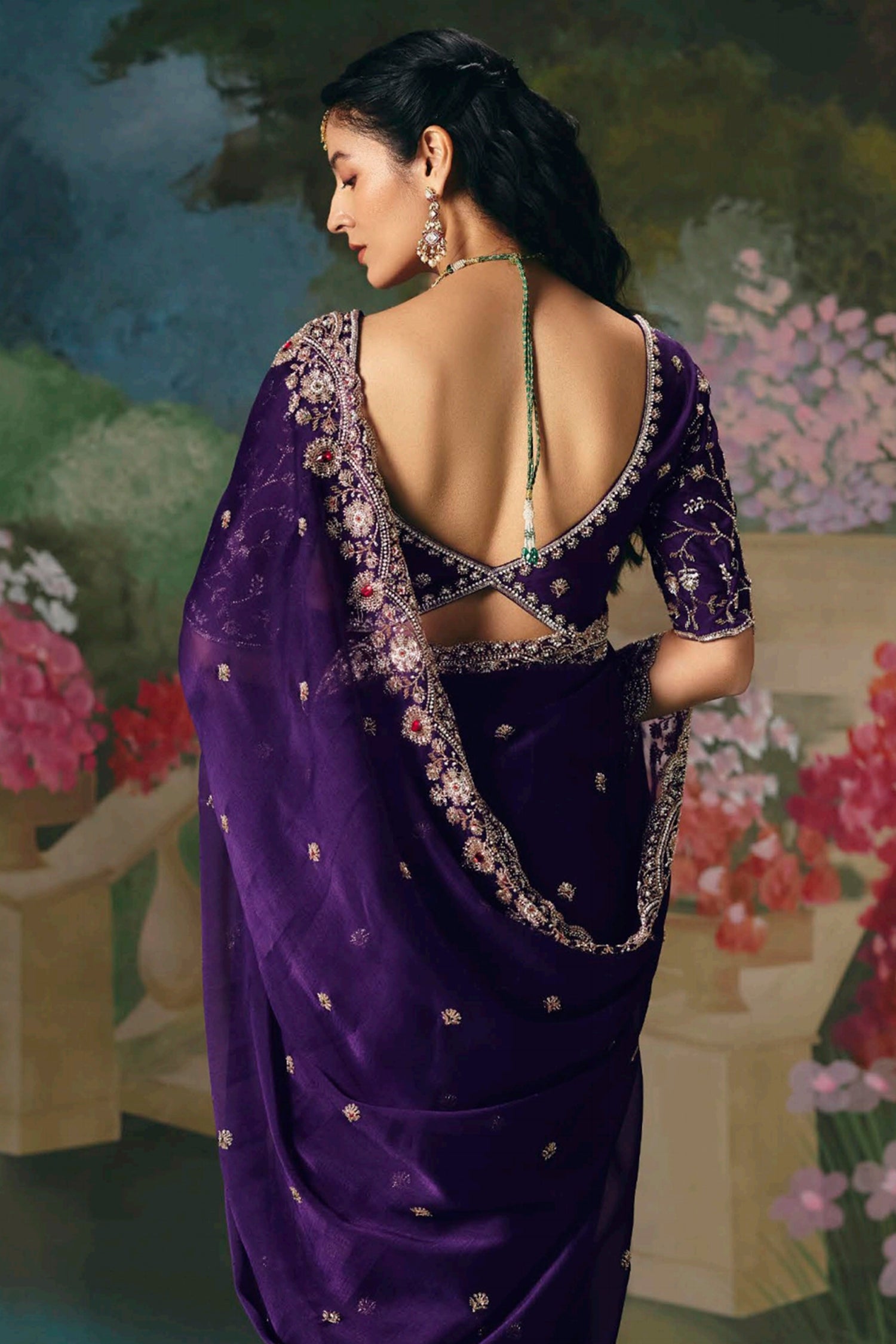 Designed with a deep royal purple shade, this exquisite saree is crafted from premium, lightweight Organza fabric. The saree is defined by a striking scalloped border that is meticulously detailed with gold-toned embroidery, shimmering sequins, and intricate cutdana work. Elegant floral bootis are scattered across the body of the saree, providing a delicate sparkle throughout the drape. It is paired with a matching purple blouse that features heavy floral embroidery and stone work on the sleeves and neckline, creating a cohesive and luxurious traditional look. This ensemble is a premier choice for grand weddings, evening receptions, and festive celebrations.
