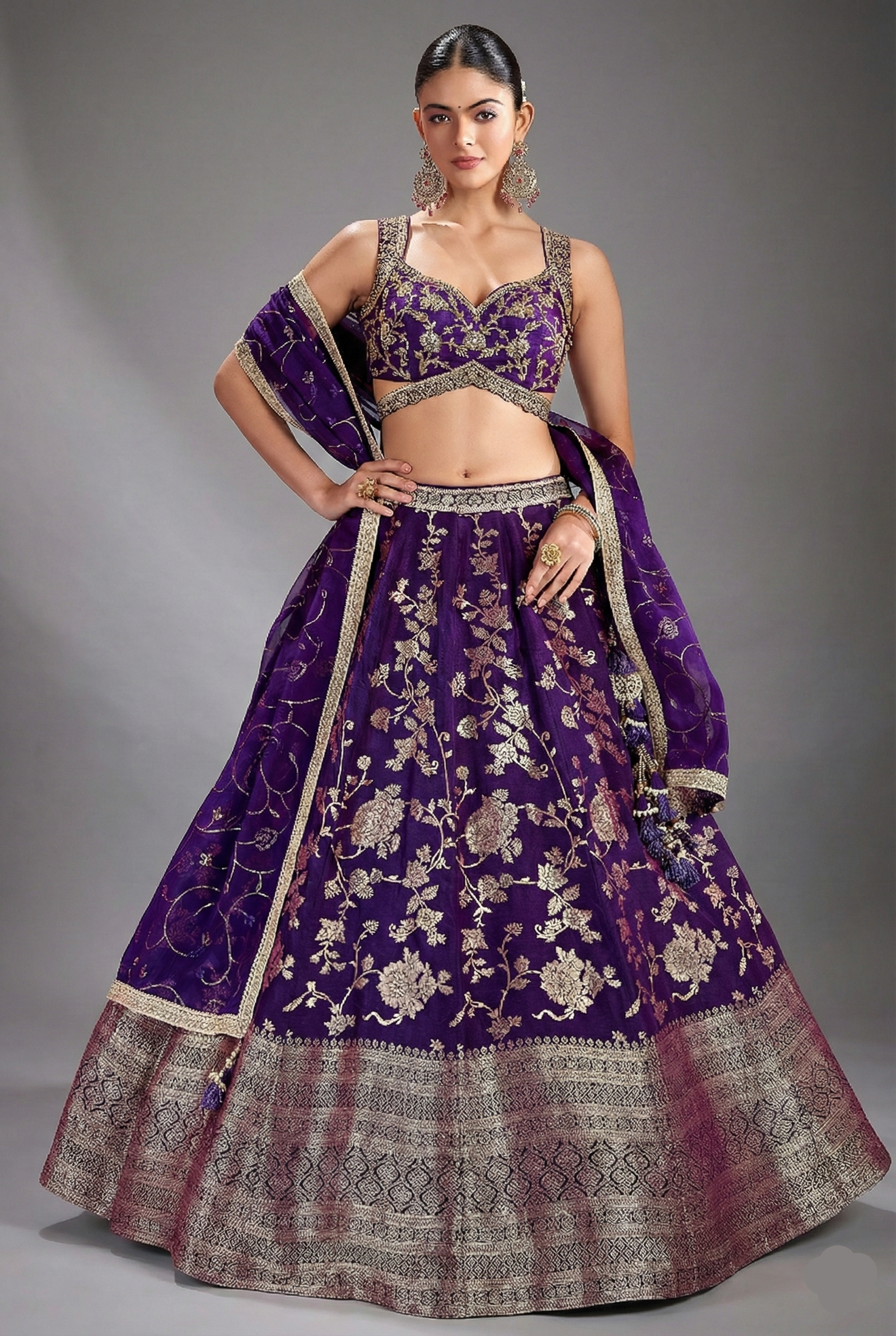 Embrace timeless majesty in this Purple Silk Lehenga , featuring an exquisite all-over floral zari jaal. The intricate golden threads weave a tapestry of blooming vines across the premium silk base, anchored by a magnificent heavy zari border at the hem that adds a royal weight to the silhouette. The voluminous flare and the rich texture of the fabric ensure a grand, queenly presence for any special occasion.The ensemble is paired with a striking matching blouse, designed with a sophisticated sweetheart neckline and elegant straps that offer a modern, feminine touch. The blouse is a showcase of artisanal skill, meticulously hand-adorned with shimmering Zardosi, sequins, and golden threadwork that perfectly mirrors the floral patterns of the lehenga. A coordinated sheer dupatta with a delicate zari border and handcrafted tassels completes this high-fashion ethnic look. Perfectly suited for grand weddings or royal receptions, this lehenga is a definitive statement of refined Indian luxury.
