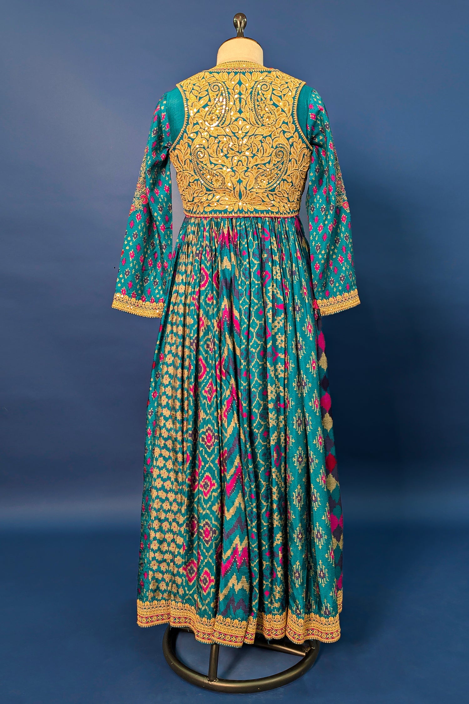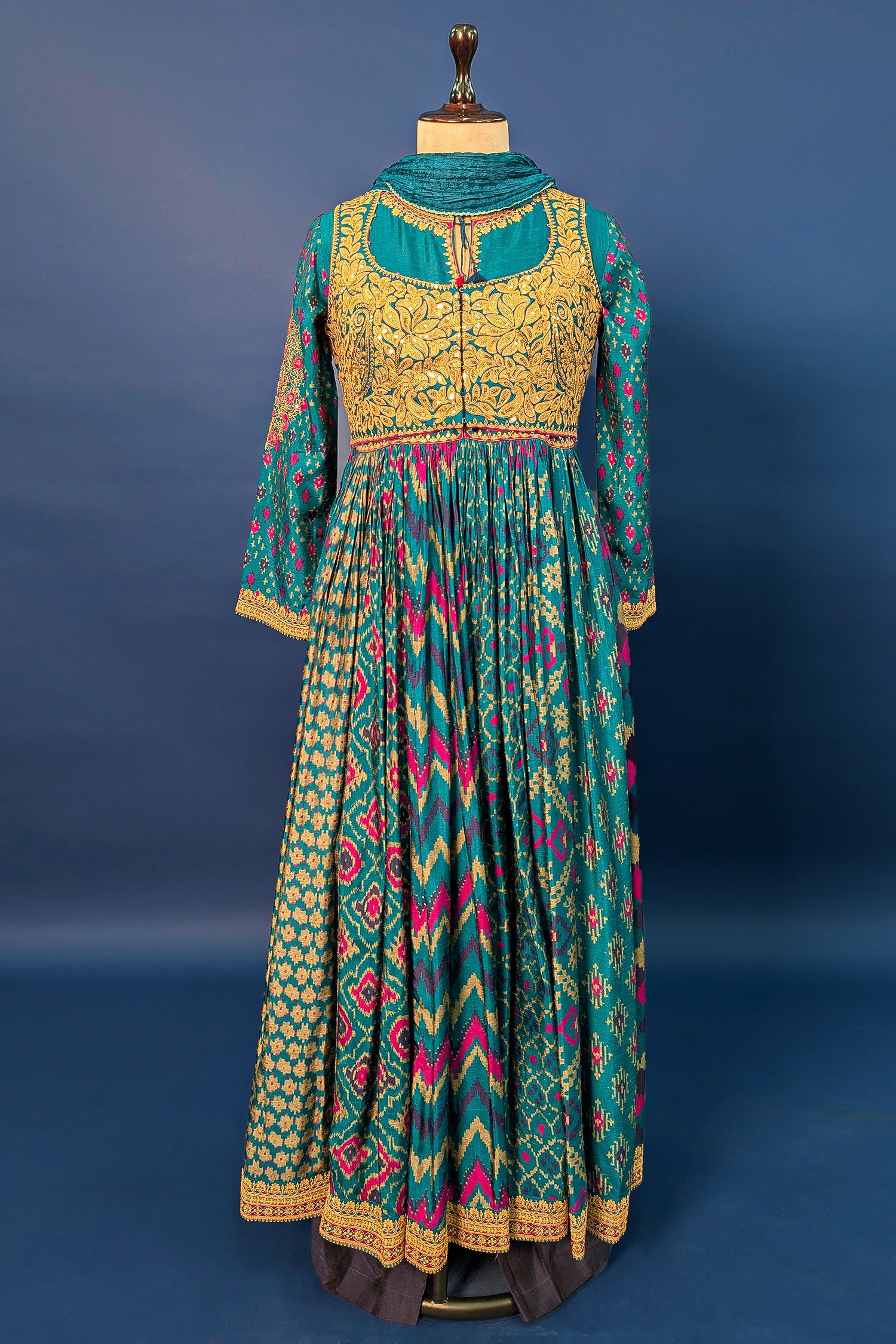 Make a stunning ethnic statement in this Rama Blue Silk Anarkali Suit, featuring a vibrant and timeless print. The ensemble is defined by a beautifully layered koti (vest-style bodice) that is lavishly adorned with intricate gold sequin and thread embroidery in ornate floral motifs. The long, voluminous Anarkali kurta showcases a rhythmic pattern of geometric designs in shades of pink and teal, finished with a delicate embroidered border at the hem. This elegant set is an ideal choice for weddings, cultural festivals, or grand celebratory events.