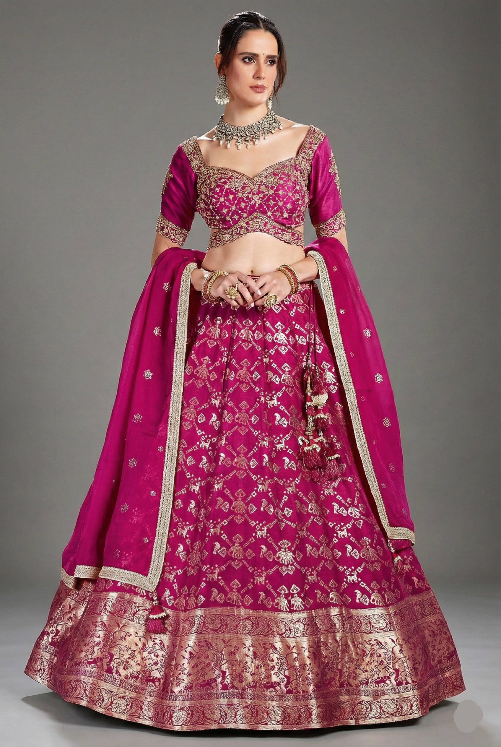 Exude a look of royal sophistication in this Rani Pink Banarasi Silk Lehenga, featuring a breathtaking all-over golden zari weave. The intricate traditional motifs create a shimmering tapestry across the flare, anchored by a magnificent heavy zari border at the hem that showcases master craftsmanship. The structured drape and voluminous silhouette ensure a commanding presence at any grand celebration.The ensemble is paired with a striking matching blouse, featuring a modern sweetheart neckline and elegant half-sleeves. The blouse is a showcase of artisanal detail, intricately hand-adorned with shimmering Zardosi and fine threadwork that complements the lehenga's golden weave. A coordinated sheer dupatta with a delicate zari border and handcrafted tassels completes this high-fashion ethnic look. Perfectly suited for grand weddings, festive galas, or royal receptions, this lehenga is a masterpiece of fine Indian heritage.