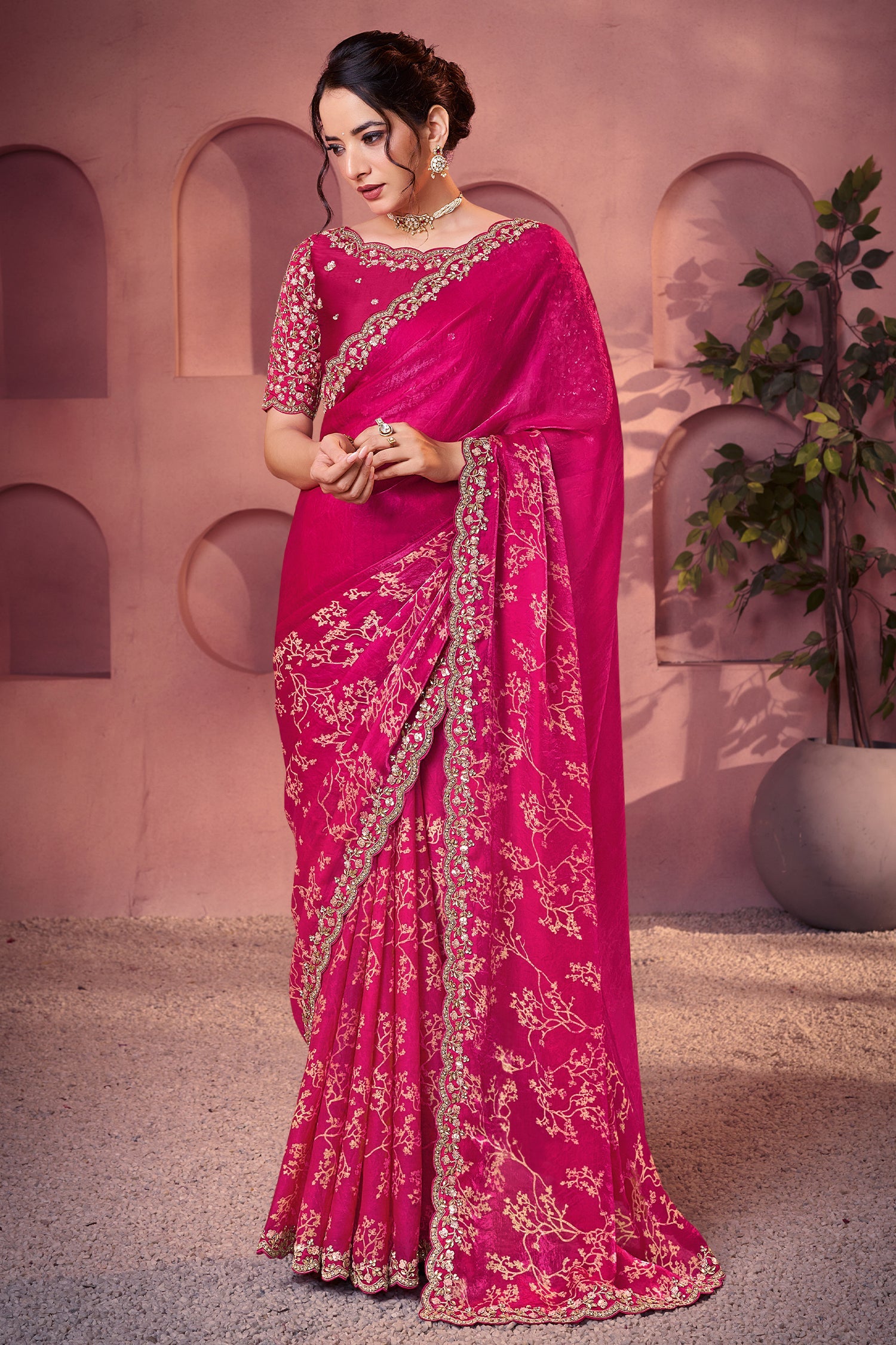 This Rani Pink Satin Floral Print Saree offers a bright and feminine appeal. The soft satin fabric provides a smooth, shiny finish and a graceful drape. Beautiful floral prints enhance its charm, making it perfect for festive and party occasions. The embroidered border adds an elegant and detailed touch to the saree. It ensures you look stylish and standout wherever you go. This saree is a great pick for those who love vibrant and elegant ethnic wear.