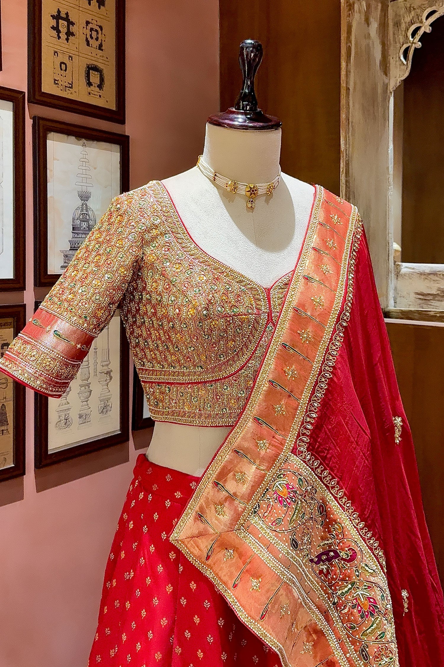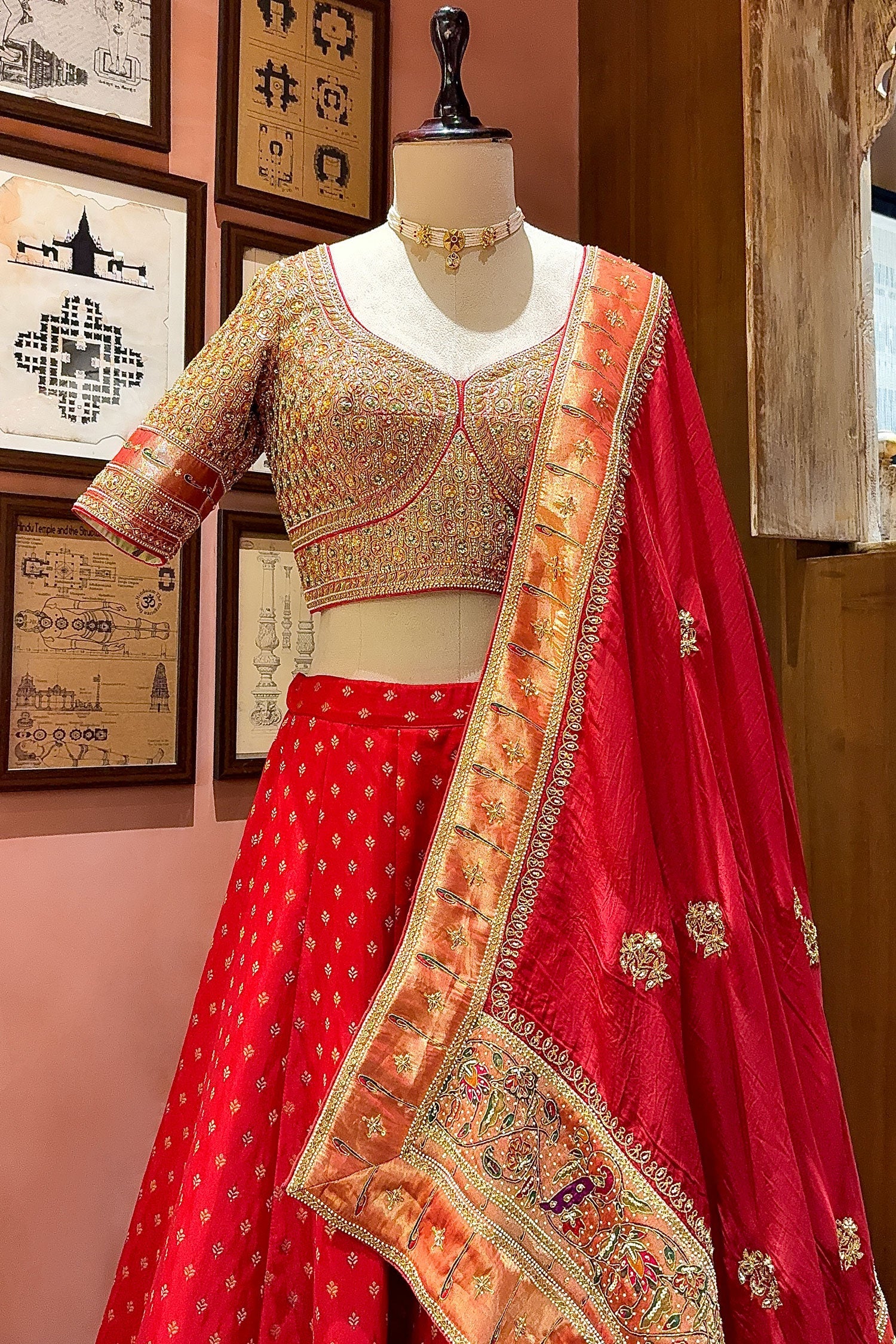 Embrace timeless tradition in this majestic Red Banarasi Silk Lehenga. The skirt is crafted from rich Banarasi silk featuring intricate gold zari weaving in classic floral patterns, further enhanced with hand-done Zardosi, beads, and shimmering sequins at the border. It is beautifully contrasted with a luminous golden tissue blouse that adds a touch of modern sheen to the ethnic look. Completed with a luxurious satin organza dupatta, this fully stitched ensemble is a masterpiece designed for weddings and royal celebrations.