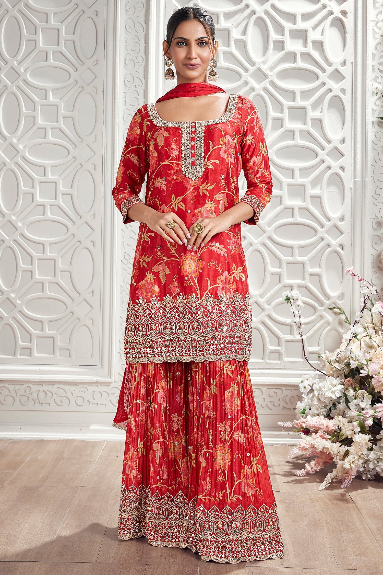Bold and beautifully festive, this red floral printed sharara suit is crafted to make a lasting impression. The kurta features vibrant floral prints, elevated with intricate mirror, cutdana, bead, and sequin work along the border and neckline for a refined sparkle. Coordinated embellishments along the sharara border add graceful movement and a cohesive finish to the ensemble. Perfect for festive celebrations, and evening gatherings, this outfit ensures you feel radiant, confident, and effortlessly styled.
