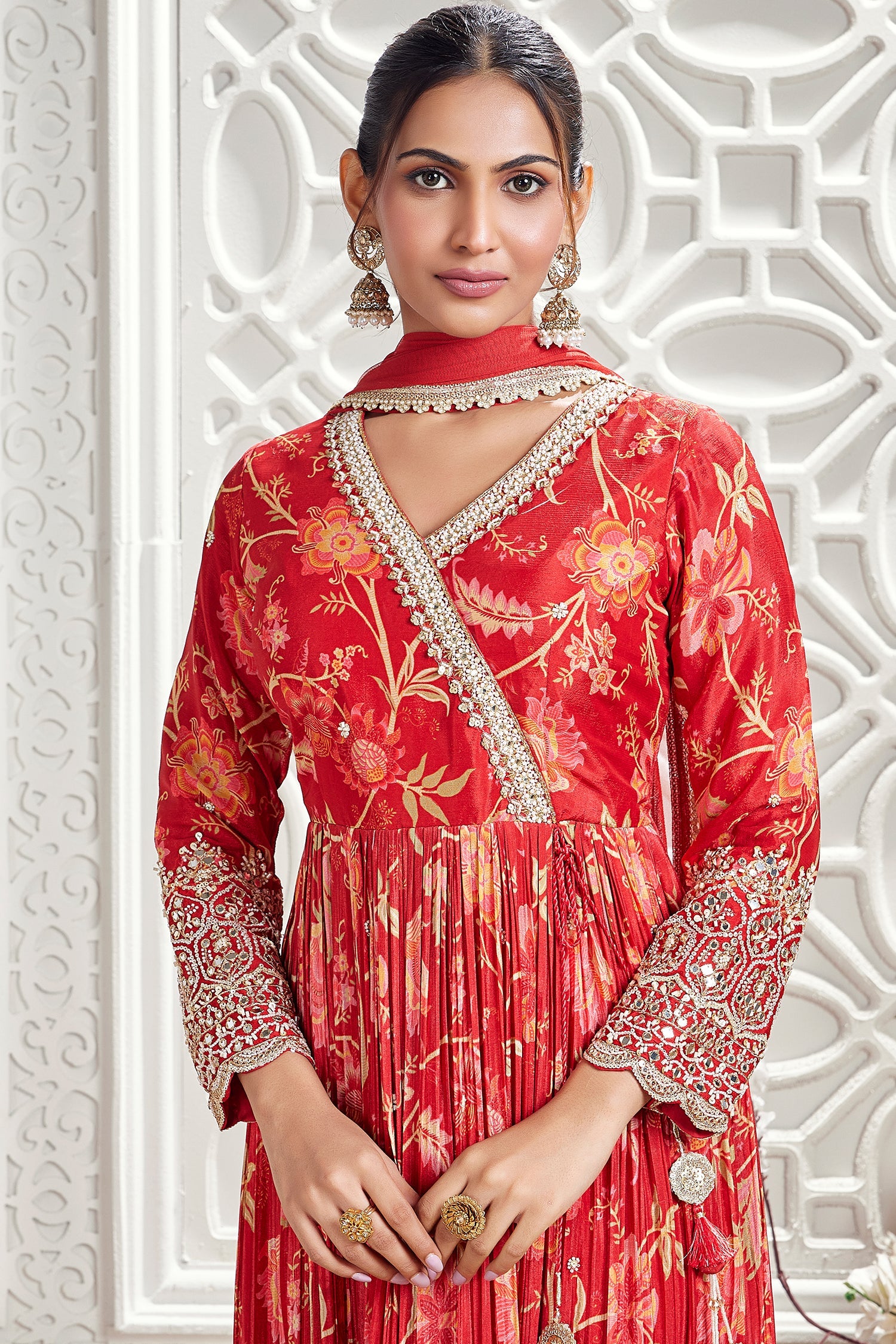 A vibrant red chinon Angrakha-style Anarkali suit brought to life with graceful floral prints spread across the silhouette. The wrap-style Angrakha pattern is beautifully highlighted with mirror, sequin, cutdana, and bead work along the neckline, sleeves, and top border, adding a festive sparkle to the design. Flowing and expressive, this Anarkali blends traditional detailing with striking print play, making it a charming choice for celebratory gatherings and festive occasions.