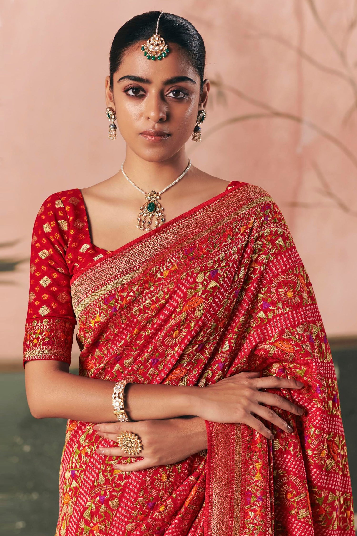 This vibrant red georgette saree showcases traditional Bandhej weaving, reflecting rich cultural artistry. Crafted from lightweight georgette fabric, it drapes gracefully and offers comfortable wear throughout the day. The striking red hue adds a bold and elegant touch, perfect for festive occasions, weddings, and special celebrations. A timeless piece that blends tradition with effortless style and sophistication.