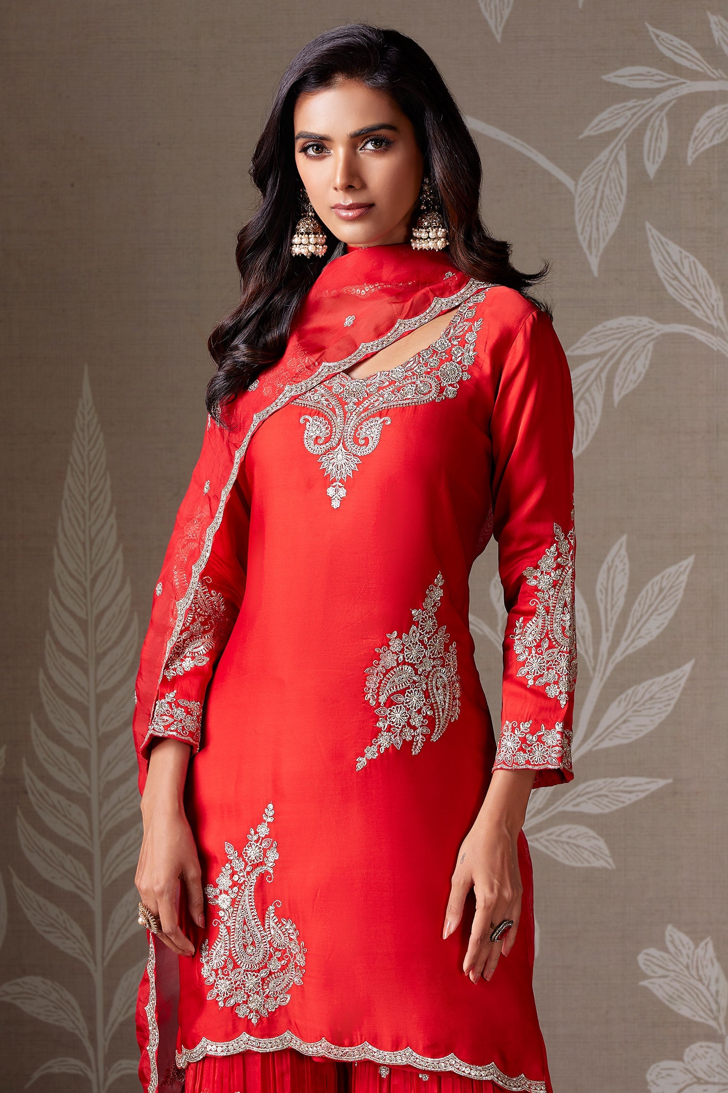 Radiant in red, this satin organza sharara suit exudes festive charm and refined elegance. The kurta features intricate sequin embroidery on the neckline, complemented by paisley motifs and delicate sequin buttas across the fabric. Finished with a scalloped border, the ensemble balances ornate detailing with graceful structure, making it a perfect pick for celebrations and festive occasions.