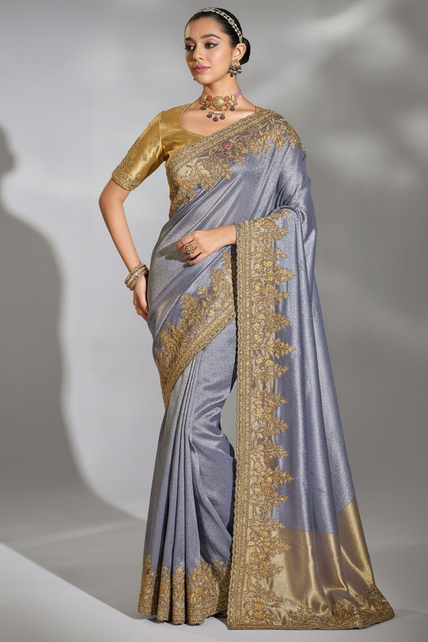 Look stunning in this Steel Blue Silk Saree featuring beautiful heavy work all over.