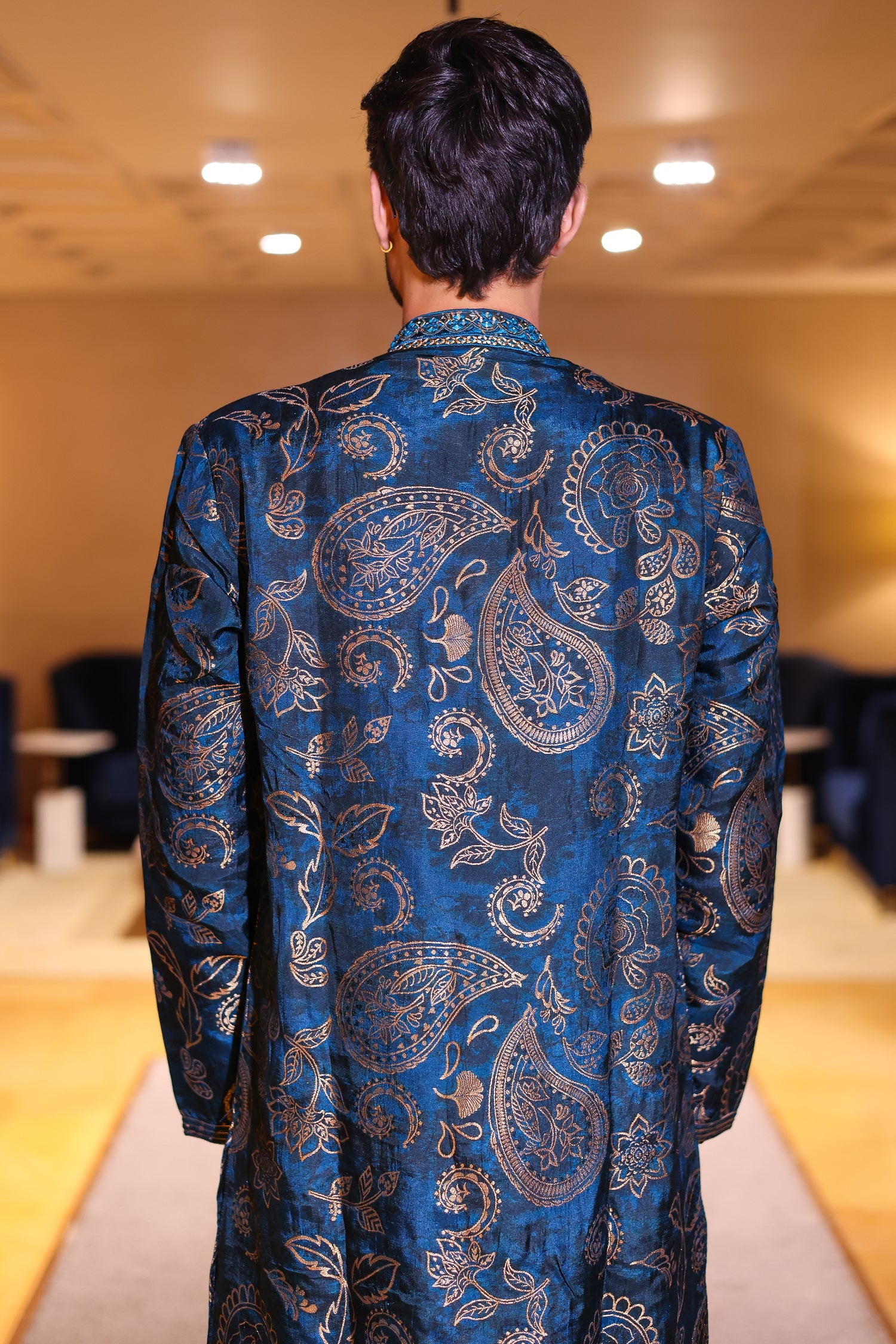 Exude regal elegance with this Teal Green Jacquard Silk Kurta Pajama, a perfect marriage of rich heritage and sophisticated style. The kurta is crafted from premium jacquard silk, featuring intricate self-weaved patterns that provide a luxurious texture and a subtle, majestic sheen. Accented with delicate mirror work and embroidery along the neckline, this ensemble captures the light with every movement. Paired with comfortable white silk pants, this traditional yet trendy set is designed for the modern man who appreciates the fine craftsmanship of classic Indian ethnic wear.