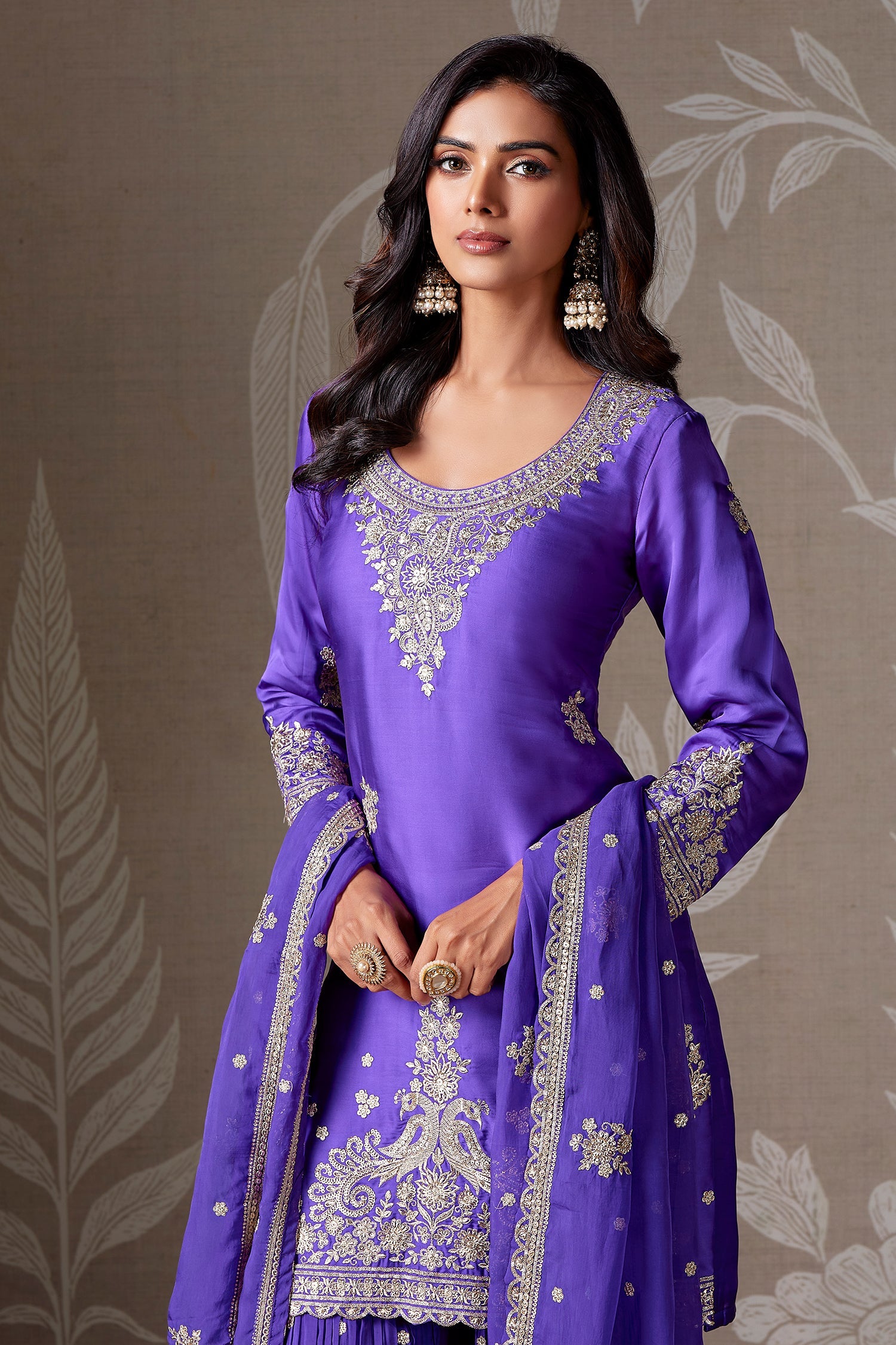 Draped in a rich violet purple hue, this satin organza sharara suit reflects refined festive elegance. The kurta is highlighted with intricate sequin embroidery along the neckline and borders, enhanced with beautifully detailed peacock motifs that add a regal touch. Lightly structured with a soft sheen, this ensemble balances graceful movement with statement detailing, making it a charming choice for celebratory occasions and festive gatherings.