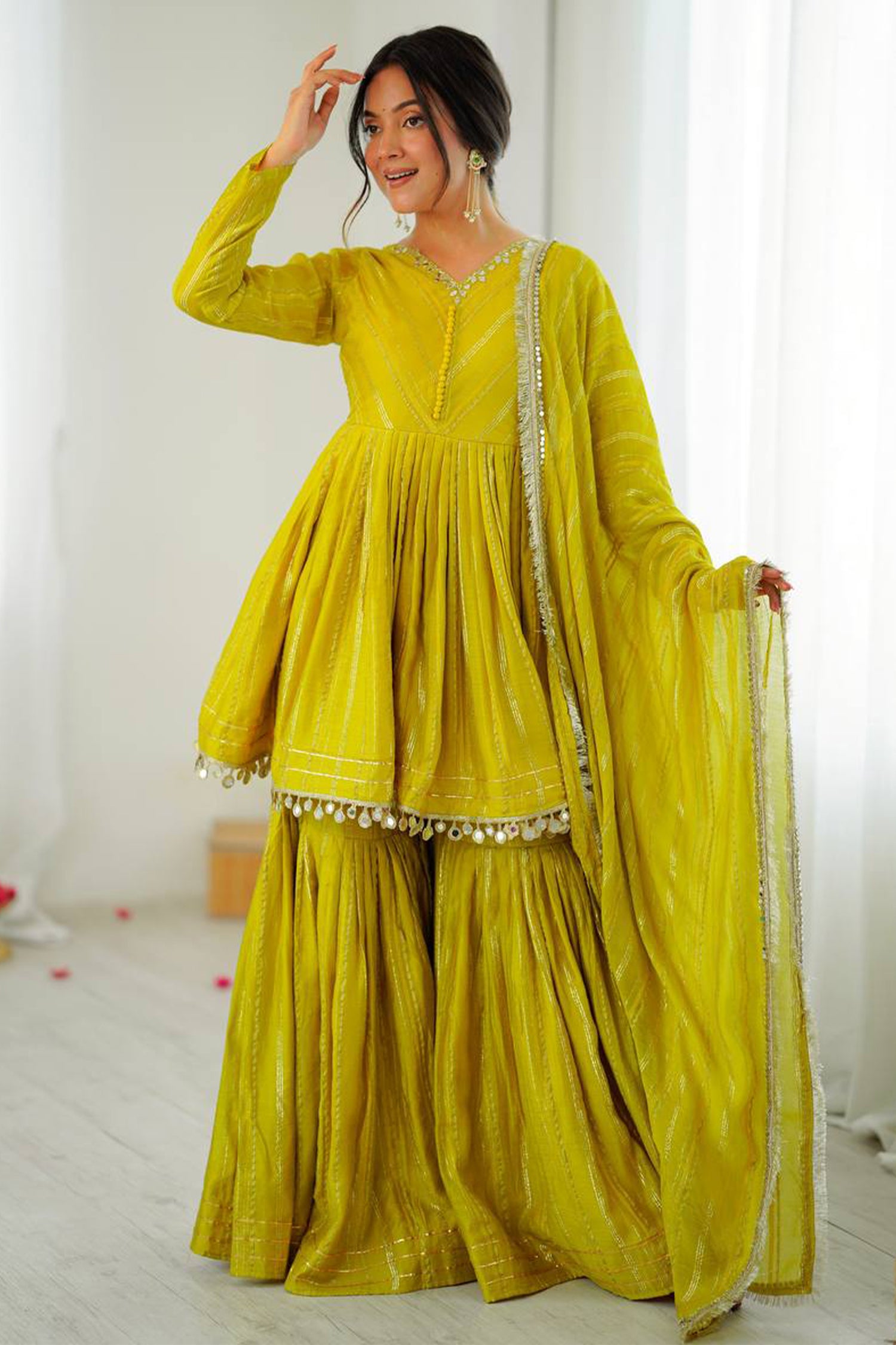 | Dupatta: | Yellow Chanderi | Bottom Style: | Sharara Style Palazzo |